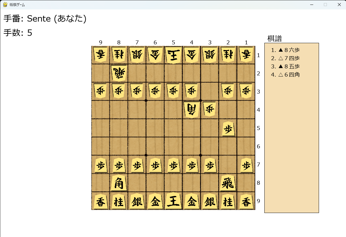 - **棋譜**: 画面右側に、これまでの指し手が棋譜として表示されます。